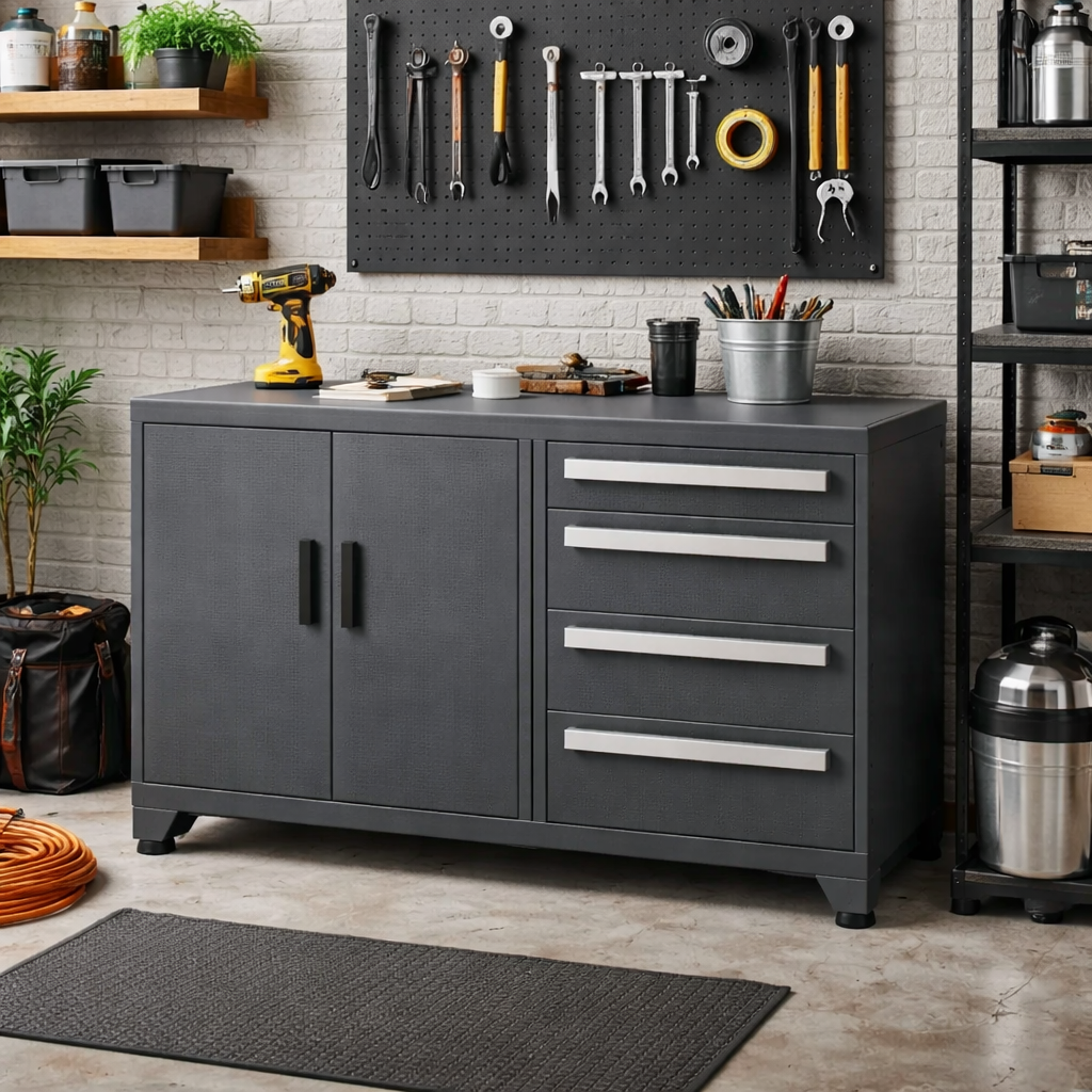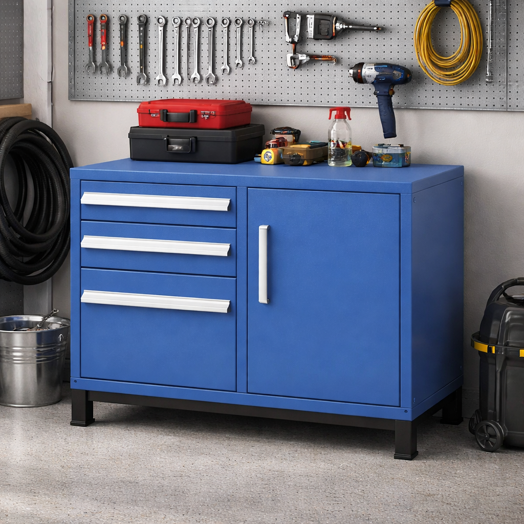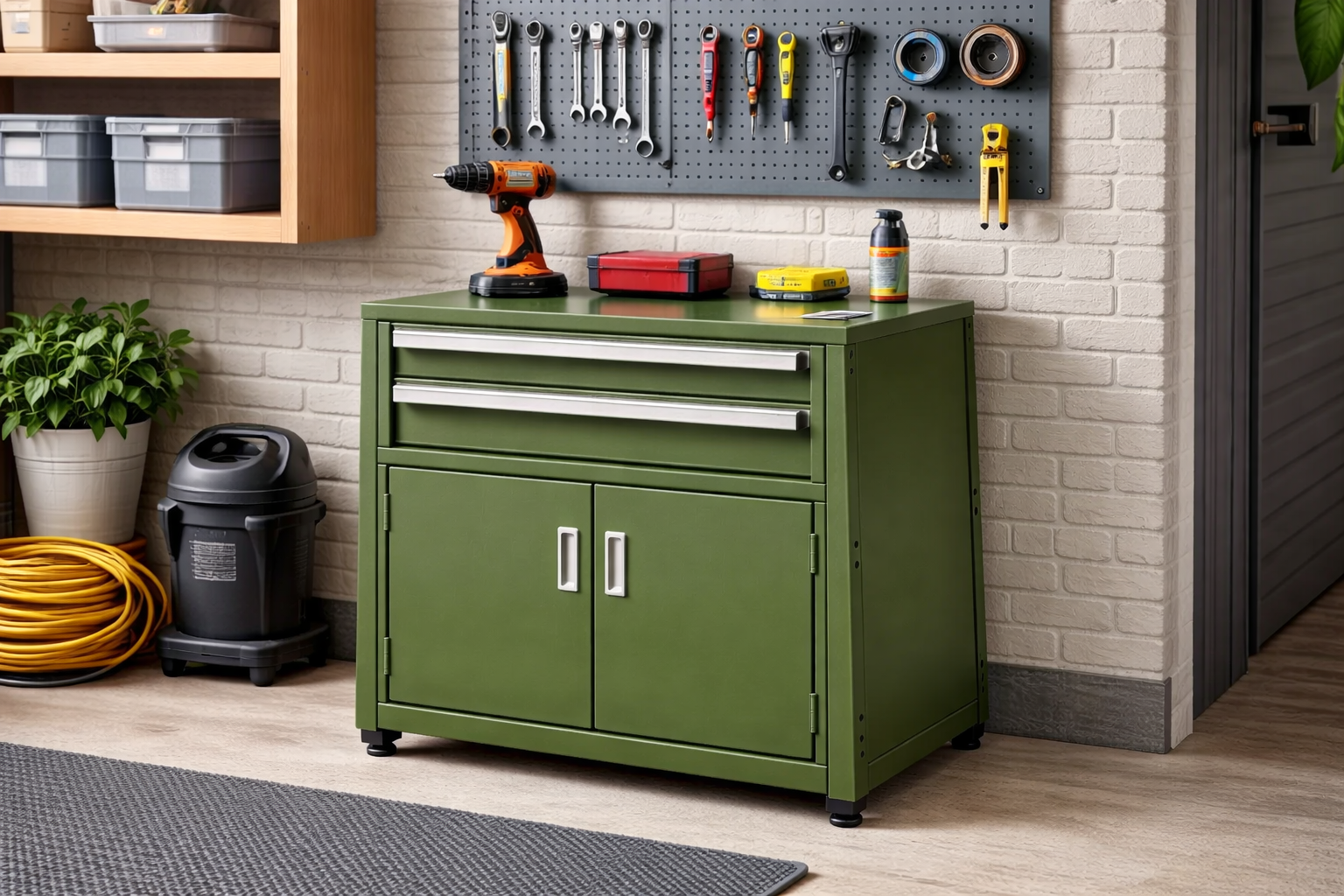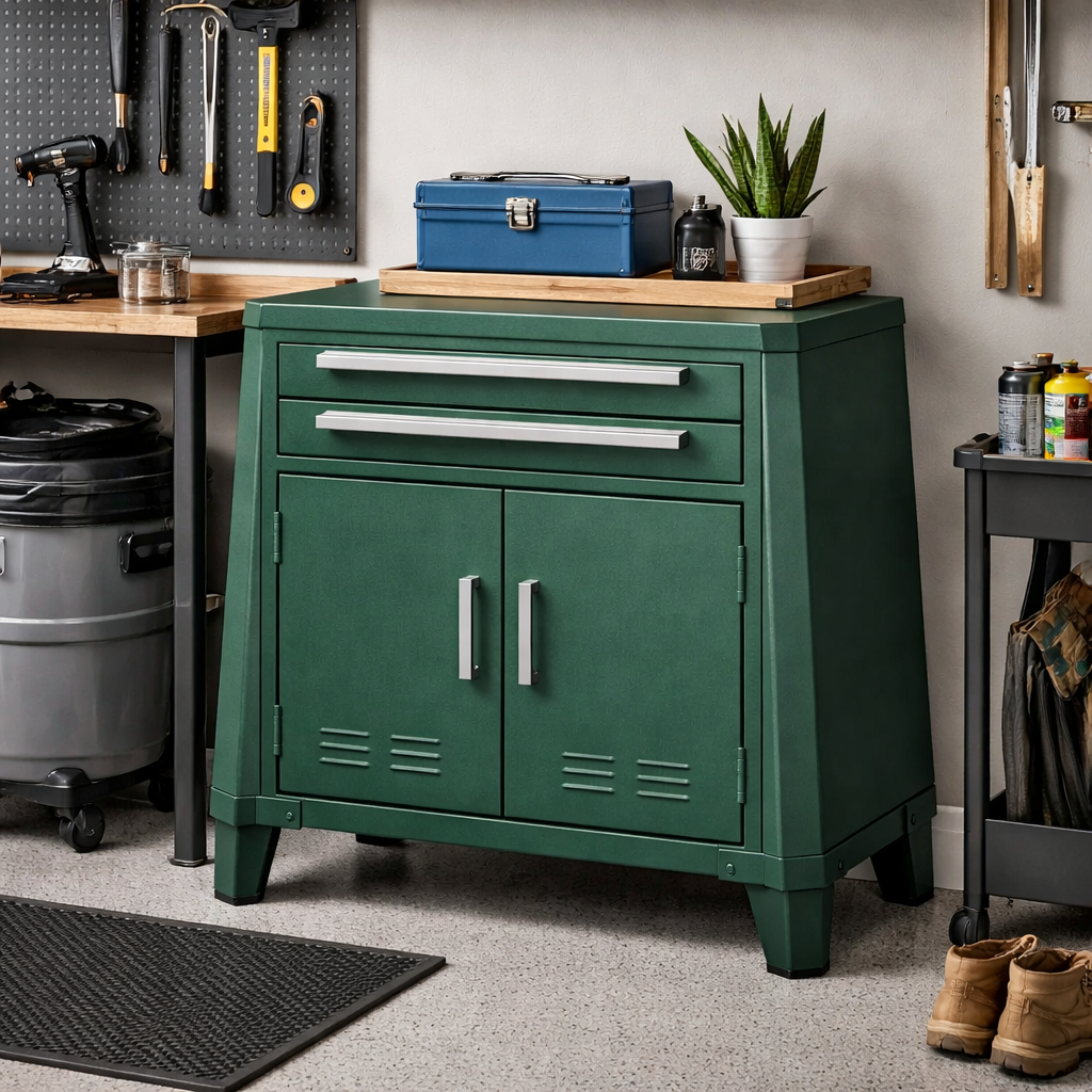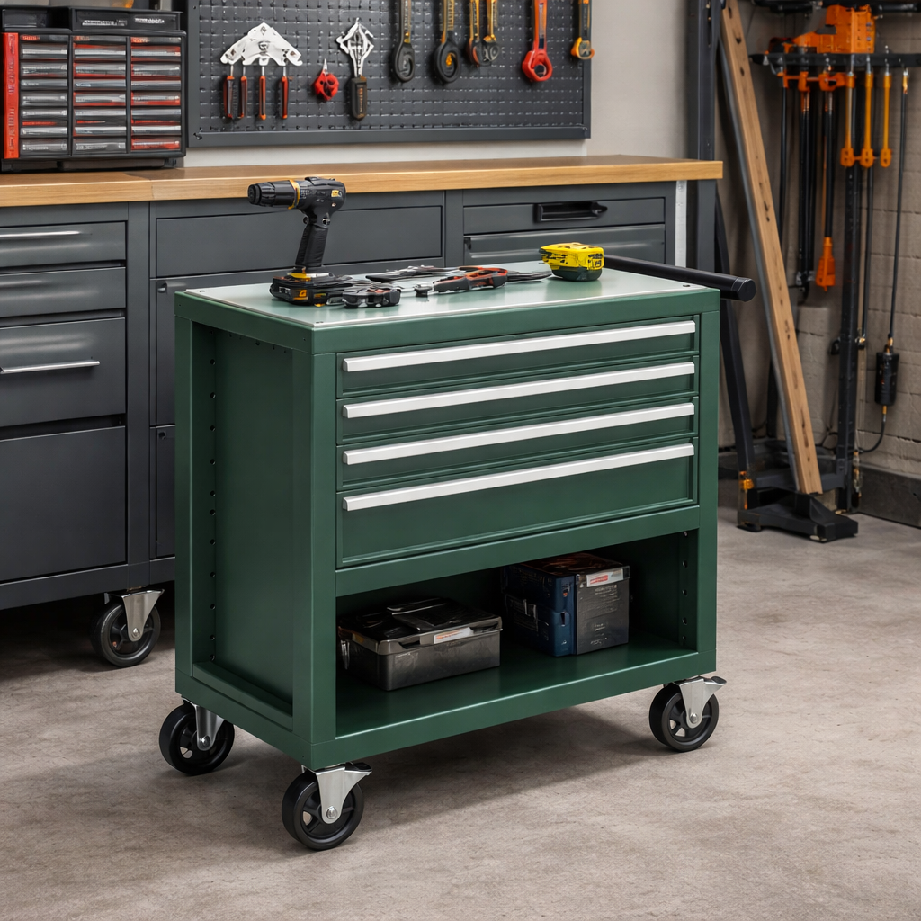 Der Werkzeugwagen besteht aus robustem pulverbeschichtetem Stahl in Grün. Er verfügt über fünf Schubladen zur sicheren Aufbewahrung. Die Rollen sind mit einer Feststellfunktion ausgestattet, und ein seitlicher Griff erleichtert die Bewegung. Die Gesamtmaße betragen 85 cm x 70 cm x 35 cm. Tragfähigkeit beträgt 150 kg.